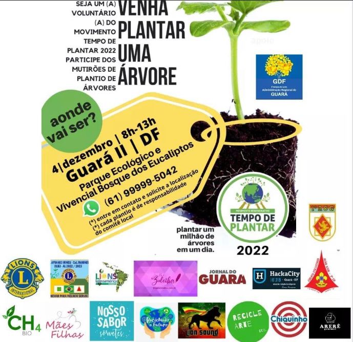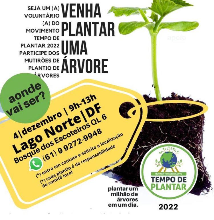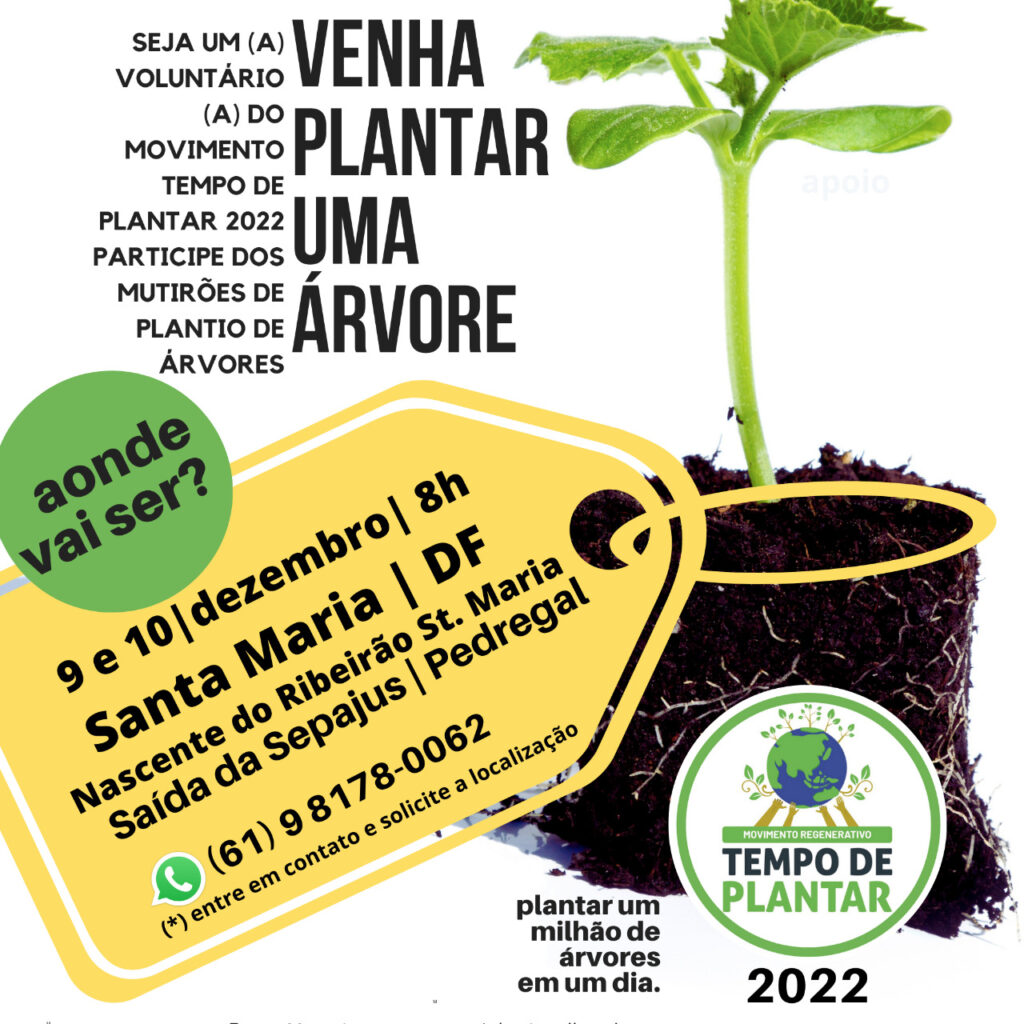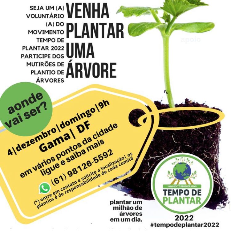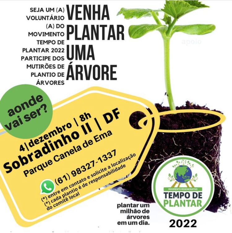 O Mutirão Nacional é realizado no primeiro domingo do mês de dezembro de cada ano como impulso à temporada de mutirões de plantio de árvores, com ênfase em espécies nativas de acordo com as fitofisionomias, por todo o país, em sítios, margens de rios e córregos, bairros, condomínios, praças, parques e outras áreas públicas, conforme acordado com os órgãos responsáveis. No Distrito Federal, estão programados mutirões em São Sebastião, Guará II e Santa Maria. Confira os locais e horários nos cards de divulgação: