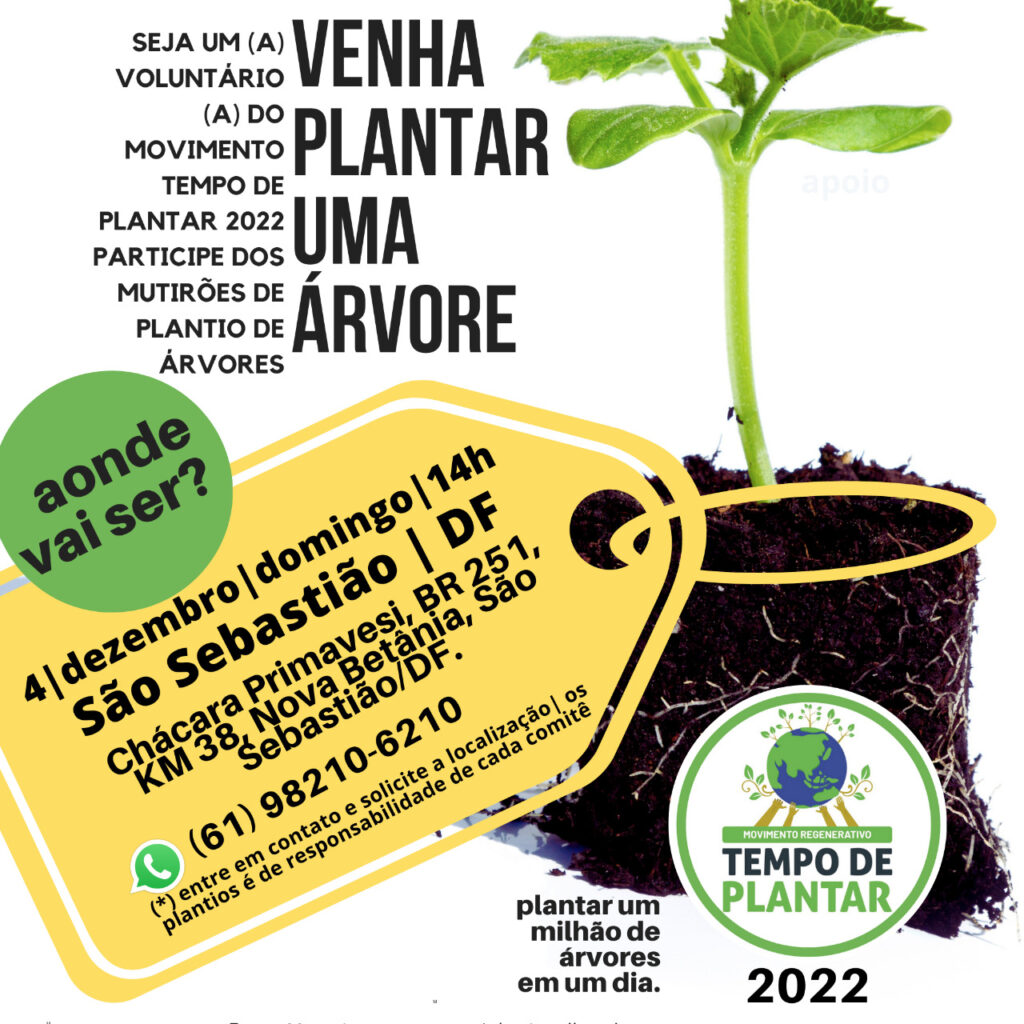 O Movimento Regenerativo Tempo de Plantar promove no domingo (4) o Mutirão Nacional de Plantio de Árvores, atividade que ocorre anualmente no período das chuvas (de outubro de um ano a março do outro), com engajamento de voluntários e voluntárias em comitês locais.
