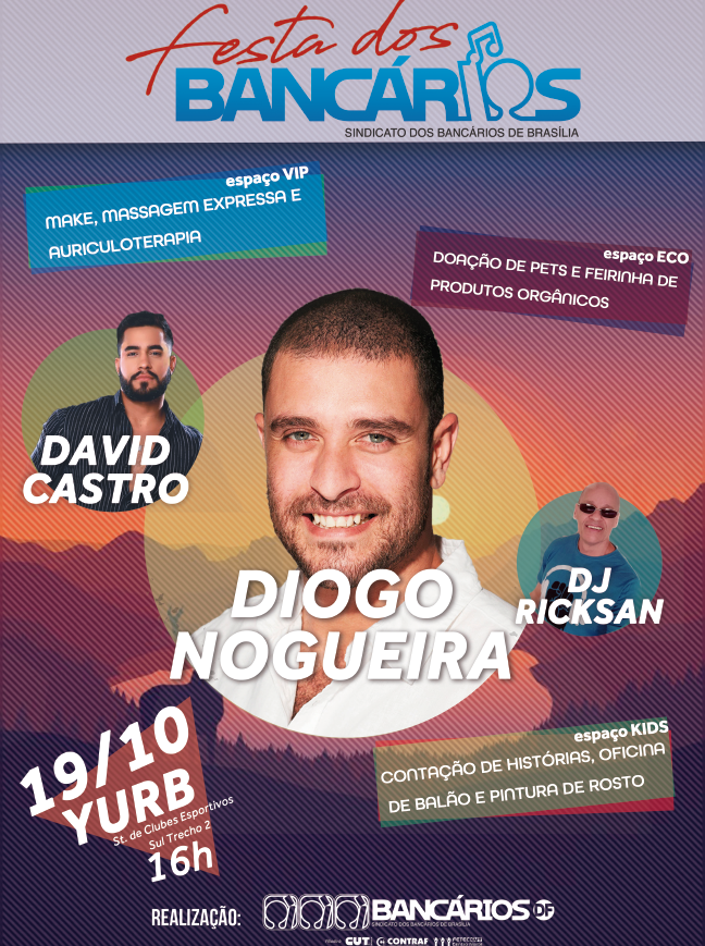 Um dos diferenciais deste ano será o horário da festa, que vai começar mais cedo, no final da tarde, para incluir as crianças. “Optamos por um novo formato para garantir uma celebração bem agradável e alegre ao ar livre, aproveitando o pôr de sol, que é especial em Brasília, com atividades que possam reunir a família dos bancários e bancárias. Afinal, é necessário dar uma pausa na correria e no estresse que somos submetidos diariamente no trabalho”, destaca a secretária de Cultura do Sindicato, Talita Régia.