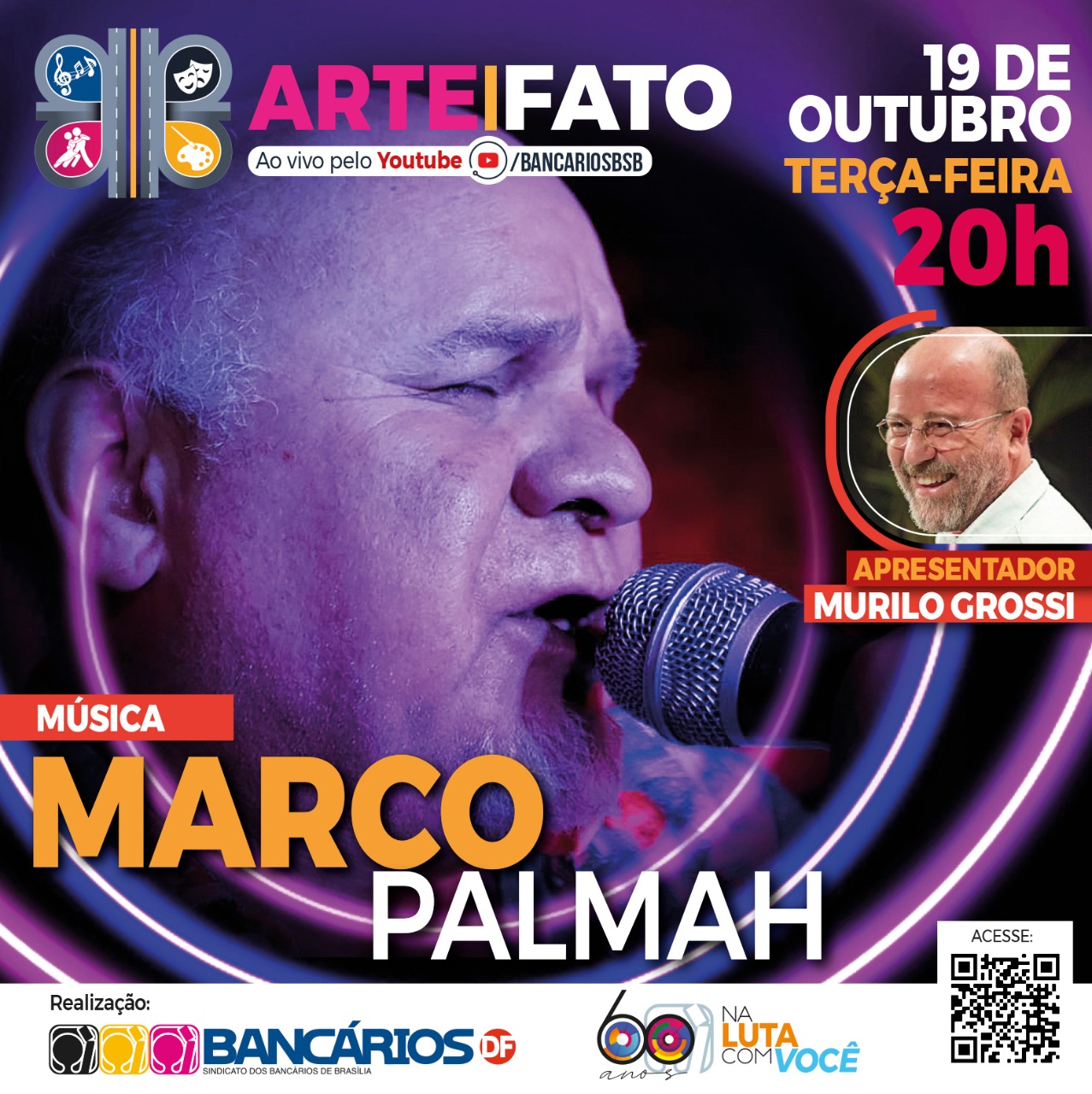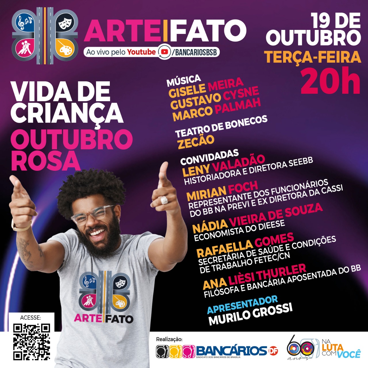 O programa Arte|Fato, realizado pelo Sindicato, chega à 14ª edição, promovendo o intercâmbio entre vertentes das artes produzidas por talentos locais e valorizando os artistas bancários e bancárias do DF. Na próxima terça-feira (19), a partir das 20h, tem atrações musicais com os cantores Gisele Meira, Gustavo Cysne e Marco Palmah, além de debates sobre Infância e Outubro Rosa.