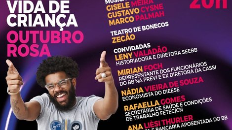 Para abordar os temas Infância e Outubro Rosa, o ato Murilo Grossi, que conduz o programa, vai receber a ex-dirigente do Sindicato Míriam Foch; a historiadora e pesquisadora de gênero Leny Vieira; a economista Nádia Vieira de Souza, pesquisadora do Dieese (Subseção Bancários DF); a primeira bancária aprovada em concurso do Banco do Brasil, Ana Lièsi Thurler; além de Rafaella Gomes, secretária de Saúde e Condições de Trabalho da Fetec-CUT-CN, Rafaella Gomes.