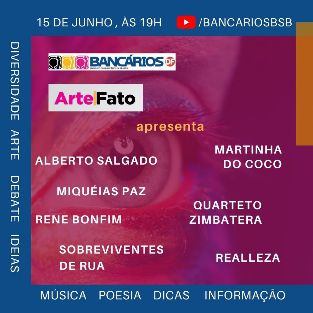 O programa Arte|Fato desta terça-feira (15/6) traz os melhores momentos de suas seis primeiras edições. Com destaque para as apresentações de Alberto Salgado, Martinha do Coco, Quarteto Zimbatera, Rene Bonfim, Sobreviventes de Rua, Realleza e Miquéias Paz. O programa vai ao ar às 19h no canal do Sindicato no Youtube (/bancariosbsb).