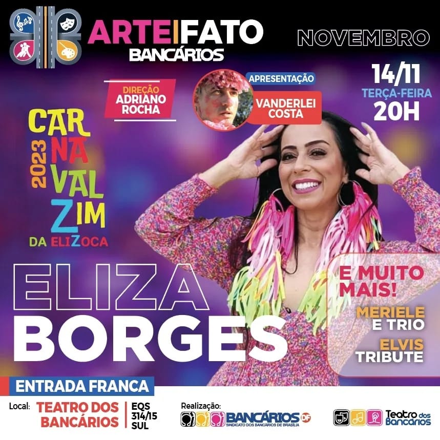 Já no Carnavalzim da Elizoca, liderado pela talentosa Eliza Borges, a combinação de música e dança leva ao público a energia contagiante do carnaval de trio elétrico. Nesse projeto, Eliza, acompanhada por banda, cria uma atmosfera festiva e envolvente com voz poderosa e presença de palco cativante. No repertório, há clássicos dos anos 80, 90 e 2000, aliados a sucessos de artistas consagrados.