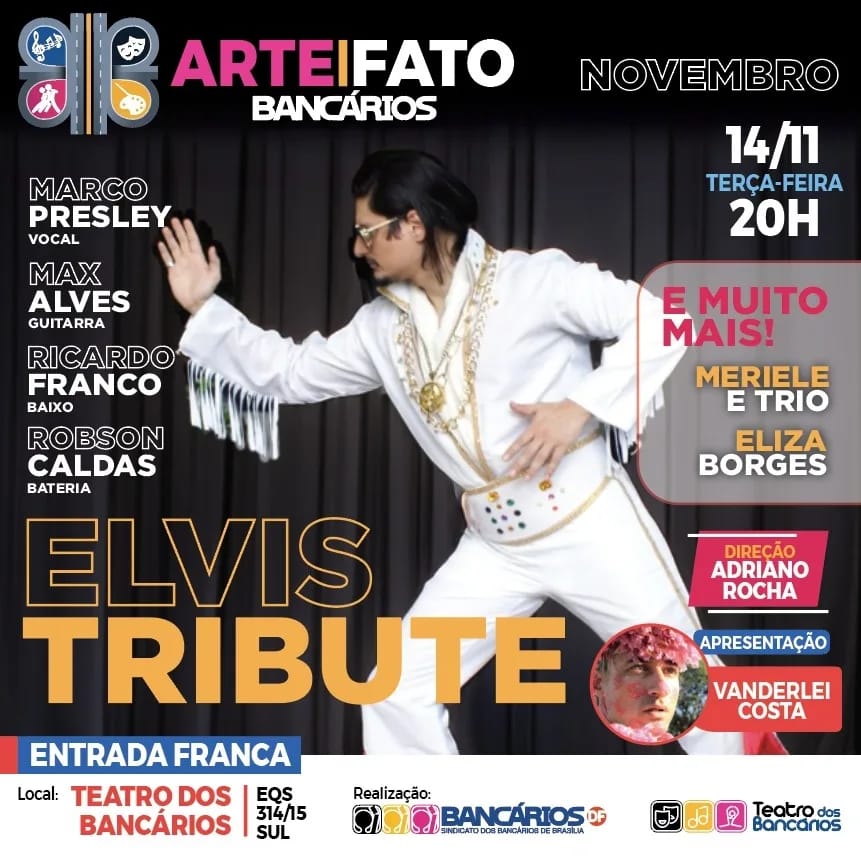 E a Elvis Tribute Band traz a sensação de estar em um show de Elvis. A banda, formada por virtuoses instrumentistas, tem à frente cantor com vocal fiel ao do Rei do Rock. No repertório desse tributo, toda a influência que moldou a carreira do astro, como o country de Waylon Jennings, o pop de Neil Diamond, até mesmo o rock grandioso do Led Zeppelin e, claro, sucessos da carreira de Presley. Na formação da banda estão Marco Presley (vocal), Mark Alves (guitarra), Ricardo Franco (baixo) e Robson Caldas (bateria).
