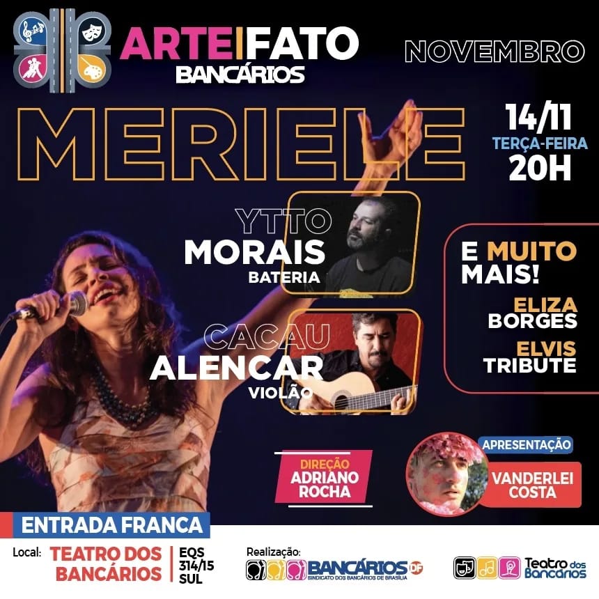 Três shows irão conduzir o público do Teatro dos Bancários (EQS 314/15), casa do projeto, por momentos distintos na noite do dia 14 de novembro (terça-feira), na 34ª edição do Arte Fato, quando sobem ao palco Meriele, Cacau Alencar e Ytto Morais, no show Palavras de Amor; Eliza Borges, com o seu Carnavalzim da Elizoca; e a Elvis Tribute Band. O evento começa às 20h, com entrada franca.