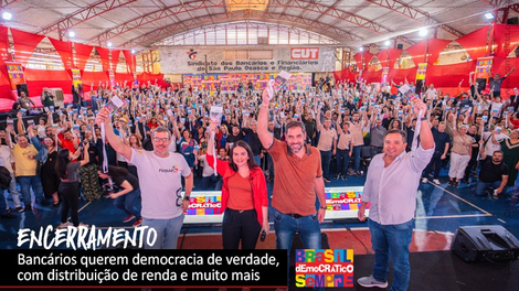 “Tivemos excelentes debates nestes três dias de conferência e tiramos resoluções sobre os principais temas de ação dos trabalhadores do ramo financeiro. Elas vão orientar o posicionamento do Comando Nacional e das entidades sindicais do nosso campo na luta pela manutenção de nossos direitos e novas conquistas”, disse a presidenta da Confederação Nacional dos Trabalhadores do Ramo Financeiro (Contraf-CUT) e coordenadora do Comando Nacional dos Bancários, Juvandia Moreira.