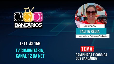 A programação da TV Comunitária de Brasília desta semana transmitirá mais uma edição do TV Bancários sobre cultura. Nesta sexta-feira, 1º de novembro, o programa recebe a secretária de Cultura do Sindicato, Talita Régia, para falar sobre a Caminhada e Corrida dos Bancários, que será realizada dia 24.