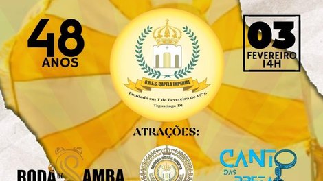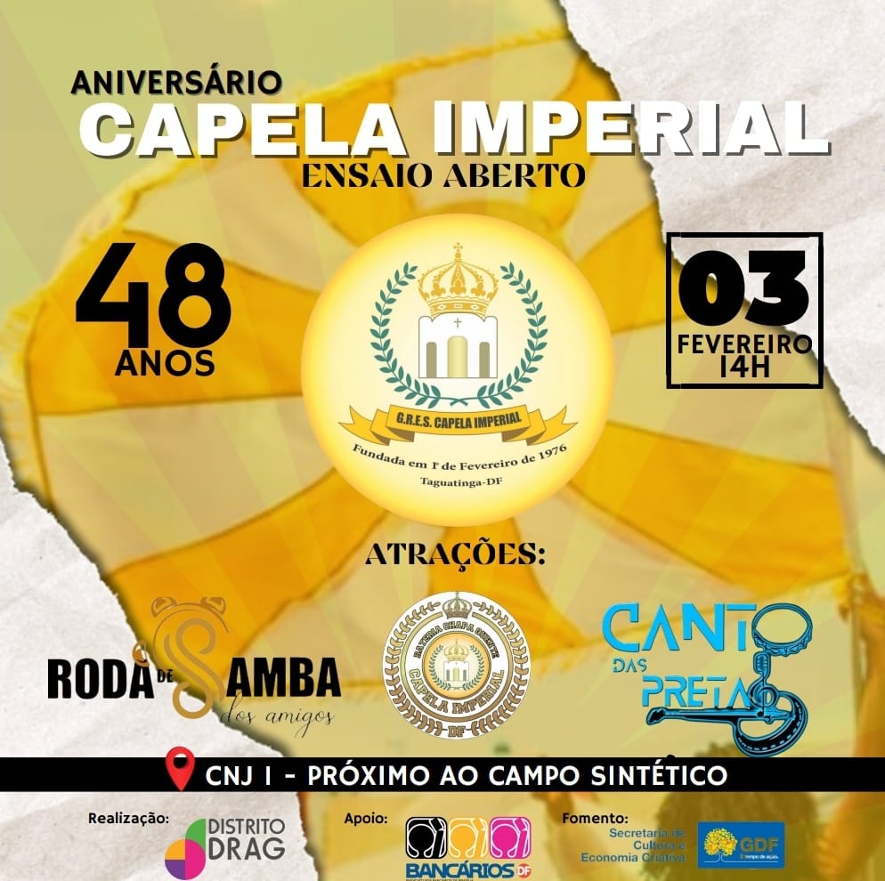 No próximo sábado (3), a Escola de Samba Capela Imperial de Taguatinga comemora 48 anos de existência com uma grande festa ao lado do campo sintético da CNJ 01, em Taguatinga Norte. A festa, que conta com o apoio do Sindicato, começa às 8h com um café da manhã, seguido de diversas atividades, como oficinas de batuque, percussão e bambolê, estandes de promoção à saúde e almoço comunitário.