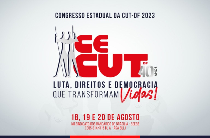 Nos dias 18, 19 e 20 de agosto, a CUT-DF realiza o Congresso Estadual de 2023 (CECUT). Sob o tema “Luta, direitos e democracia, que transformam vidas!”, o evento vai acontecer no Teatro do Sindicato dos Bancários de Brasília, com massiva participação dos sindicatos filiados à Central.