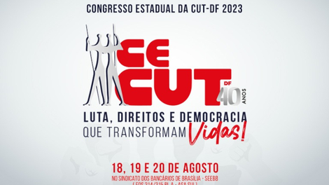 Nos dias 18, 19 e 20 de agosto, a CUT-DF realiza o Congresso Estadual de 2023 (CECUT). Sob o tema “Luta, direitos e democracia, que transformam vidas!”, o evento vai acontecer no Teatro do Sindicato dos Bancários de Brasília, com massiva participação dos sindicatos filiados à Central.