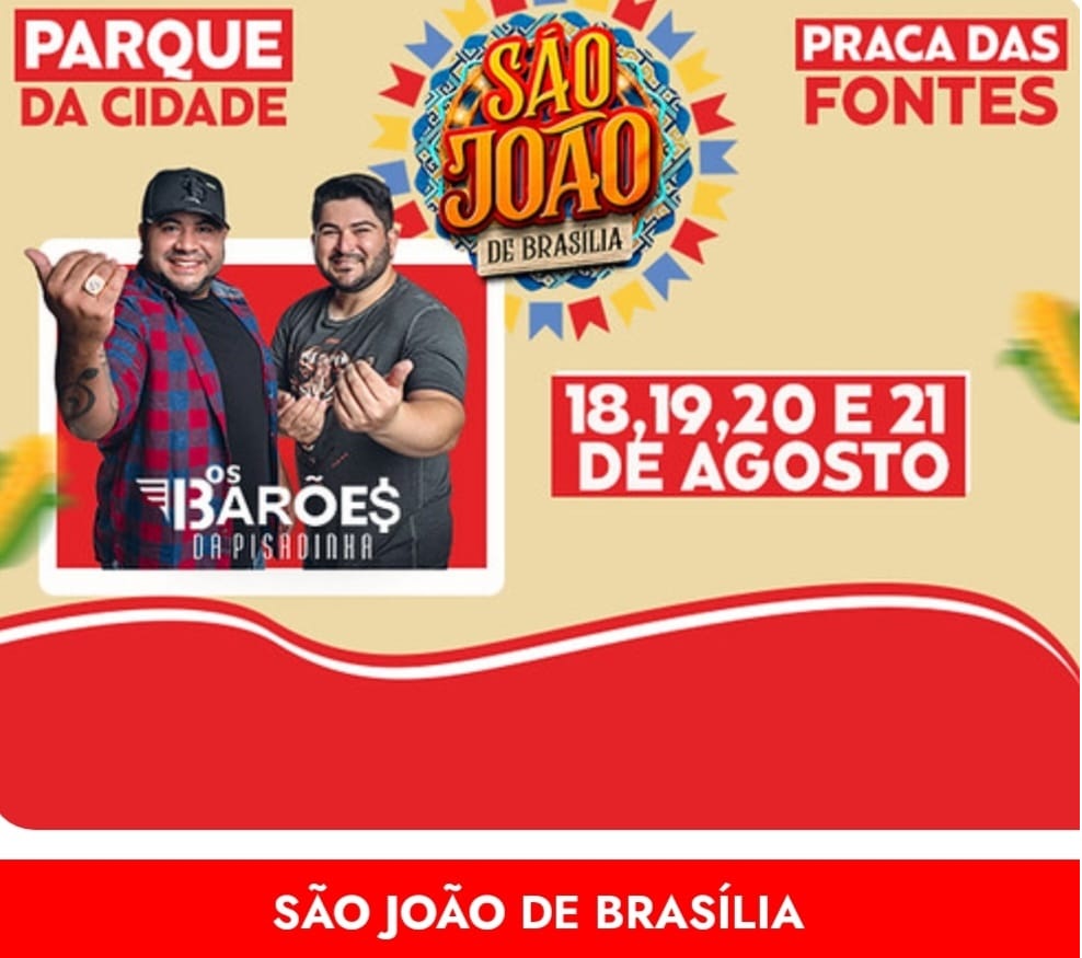 A Praça das Fontes recebe Os Barões da Pisadinha, Galã do Piseiro, Wilian & Marlon e Banda Encosta Neu, dentro do festival São João de Brasília. Além de música, comidas típicas, brincadeiras e quadrilha junina agitarão a noite.
