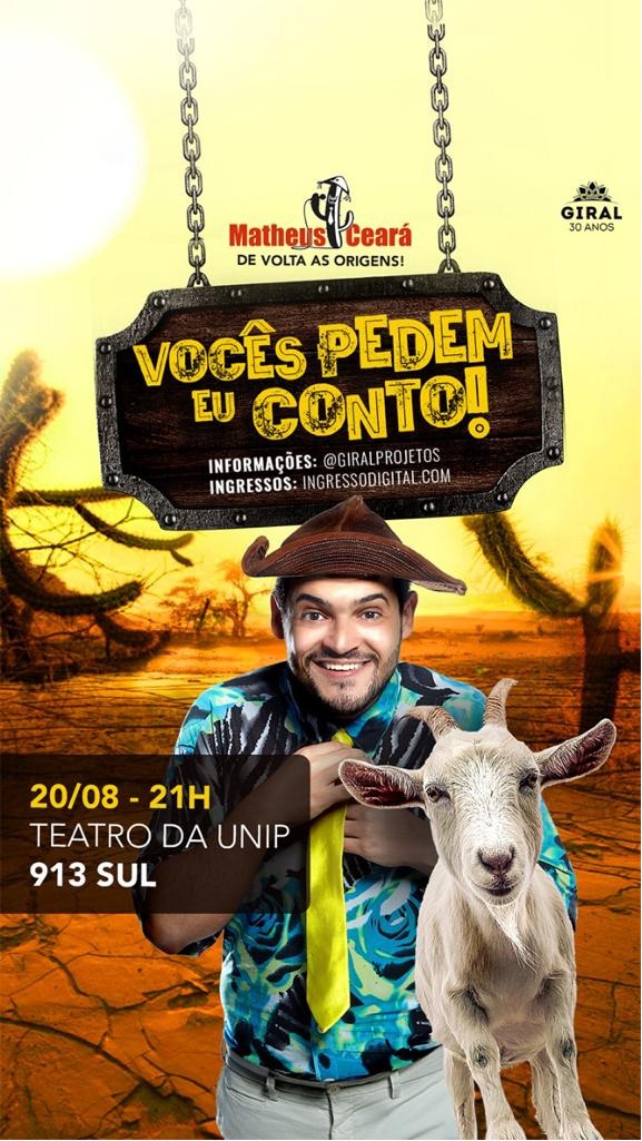 O humorista Mateus Ceará chega à cidade com um novo show de comédia, o “Vocês Pedem e Eu Conto”. A partir das 21h, no Teatro Unip, o público participa do show, tendo a possibilidade de pautar as piadas do artista.