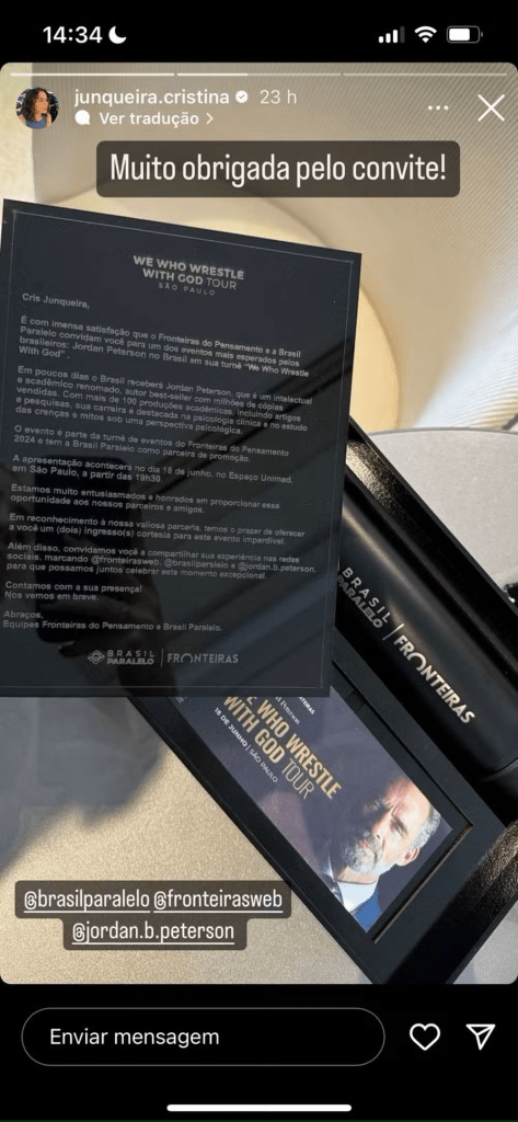 Não satisfeita em mostrar que estaria presente no evento com Peterson, que também é conhecido por livros com posições extremistas, Cristina agradece o convite e marca os perfis do próprio psicólogo, da produtora Brasil Paralelo e do Fronteiras do Pensamento, organizadora da palestra.