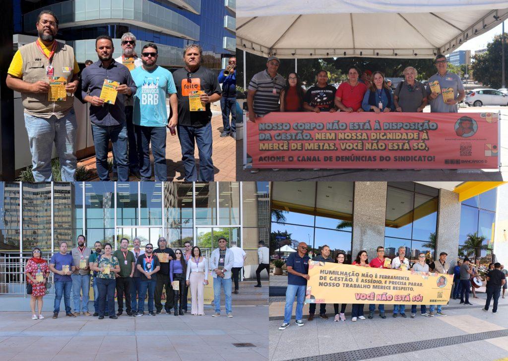 Com um grande ato em frente aos prédios do Banco do Brasil e do BRB da 201 Norte, o Sindicato lançou nesta segunda-feira (11) a campanha de divulgação do Canal de Denúncias da entidade, com a distribuição da cartilha “Será que foi assédio?”, material educativo e de acolhimento direcionado a bancárias, bancários, demais trabalhadores do ramo financeiro e população em geral.