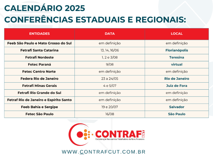 Das 11 federações que fazem parte do Comando Nacional dos Bancários, 7 já definiram locais e datas de suas conferências. Veja: