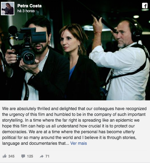 "Estamos absolutamente emocionados e extasiados por nossos colegas terem reconhecido a urgência deste filme, e honrados por estarmos na companhia de documentários tão importantes. Numa época em que a extrema direita está se espalhando como uma epidemia, esperamos que esse filme possa nos ajudar a entender como é crucial proteger nossas democracias. Está se tornando cada vez mais evidente o quanto o pessoal é político para tantos ao redor do mundo, e acredito que é por meio de histórias, linguagem e documentários que as civilizações começam a se curar.