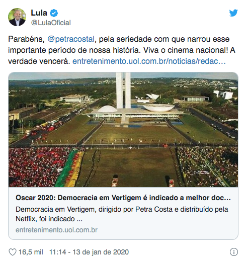 Para o ex-presidente Lula a indicação ao Oscar 2020 de melhor documentário de “ Democracia em Vertigem”, é motivo de comemoração. No Twitter, Lula, parabenizou a diretora do documentário, Petra Costa.