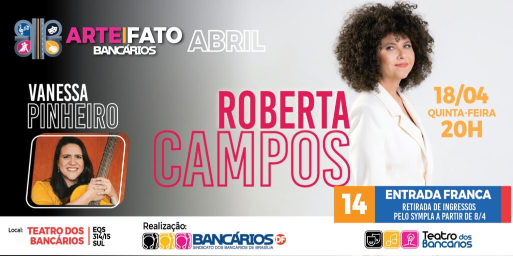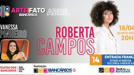 Com direção de Adriano Rocha, o projeto cultural Arte|Fato retorna ao palco do Teatro dos Bancários, desta vez com show de Roberta Campos e da bancária e também cantora Vanessa Pinheiro. Será dia 18 de abril, às 20h, e os ingressos podem ser retirados a partir do dia 8, gratuitamente, pelo link https://www.sympla.com.br/evento/arte-fato-bancarios/2382864.