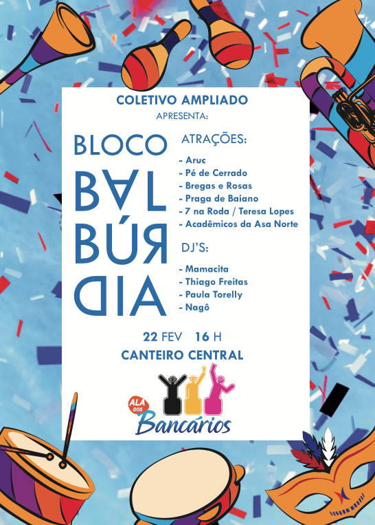 Bancários, tá chegando a hora de cair na folia! E pra isso, vem aí o Balbúrdia. Organizado e promovido pelo Coletivo Ampliado, o mais novo bloco de rua de Brasília nasce envolto de atmosfera misteriosa, mas com determinação para inventar e se integrar à tradição deste importante acontecimento social que é o carnaval de rua.