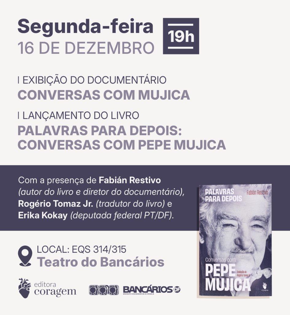 O evento, que começará às 19h, contará com a presença de Fabián Restivo, do tradutor do livro Rogério Tomaz Jr., e da deputada federal Erika Kokay (PT/DF), que debaterão as reflexões do ex-presidente uruguaio José “Pepe” Mujica, conhecido por sua trajetória política marcante e seus posicionamentos humanistas.