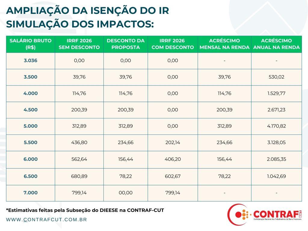 Veja na tabela* a seguir, como funcionará a isenção e os descontos, e quanto sobrará no bolso dos trabalhadores: