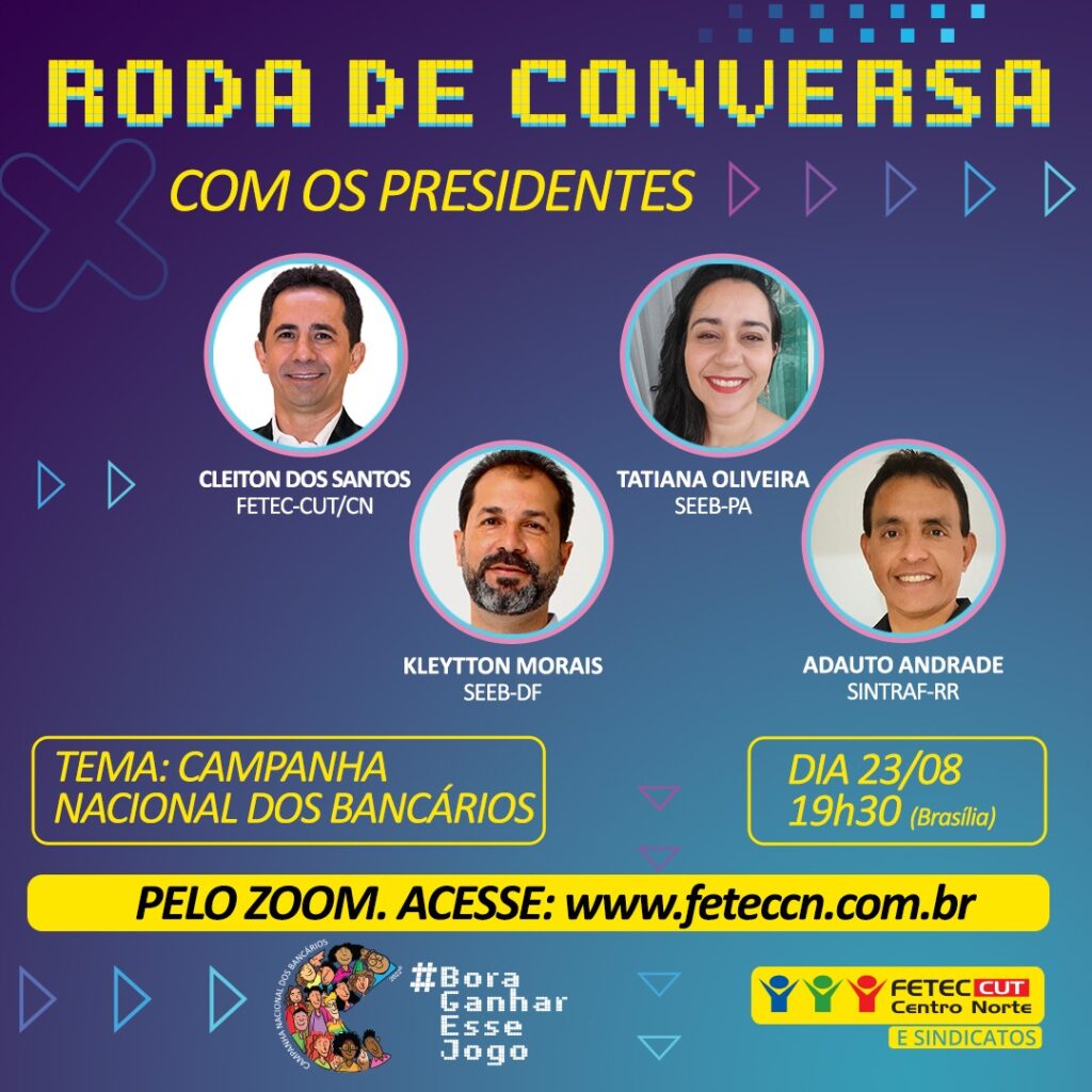 Os representantes das bancárias e dos bancários debaterão a Campanha Nacional 2022. Participarão ainda o presidente da Fetec-CUT/CN, Cleiton dos Santos, a presidenta do Sindicato do Pará, Tatiana Oliveira, e Adauto Andrade, presidente do Sindicato de Roraima.