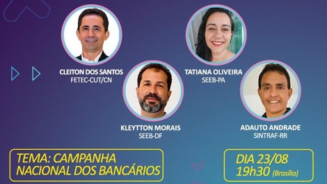 Os representantes das bancárias e dos bancários debaterão a Campanha Nacional 2022. Participarão ainda o presidente da Fetec-CUT/CN, Cleiton dos Santos, a presidenta do Sindicato do Pará, Tatiana Oliveira, e Adauto Andrade, presidente do Sindicato de Roraima.