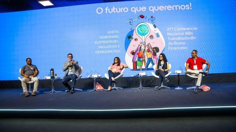 A primeira mesa da 27ª Conferência Nacional dos Bancários, realizada na manhã deste sábado (23), contou com a presença do historiador e professor de Literatura Comparada, João Cezar de Castro Rocha, para debater os rumos da democracia e da soberania brasileira.