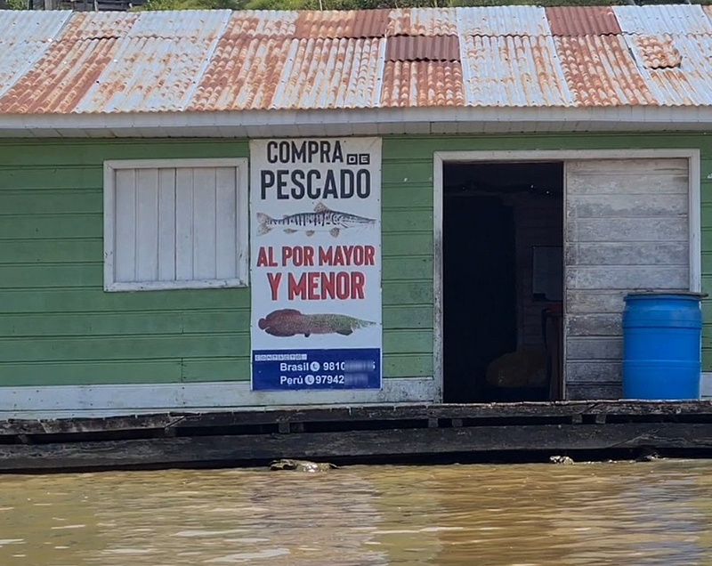 Villar não é único "patrão" da pesca ilegal na divisa com a Colômbia e o Peru. Ao entrar em território peruano pelo rio Javari, a reportagem encontrou uma balsa que anunciava a compra de pescado, no atacado e no varejo. No cartaz, a imagem é de um pirarucu, um dos peixes com maior valor comercial.