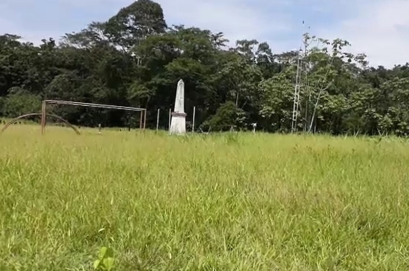 O líder indígena conta que a base foi metralhada e incendiada por narcotraficantes. Na parte de cima do barranco do rio, só sobraram os escombros, já encobertos pela vegetação, e uma torre que era usada para telecomunicações.