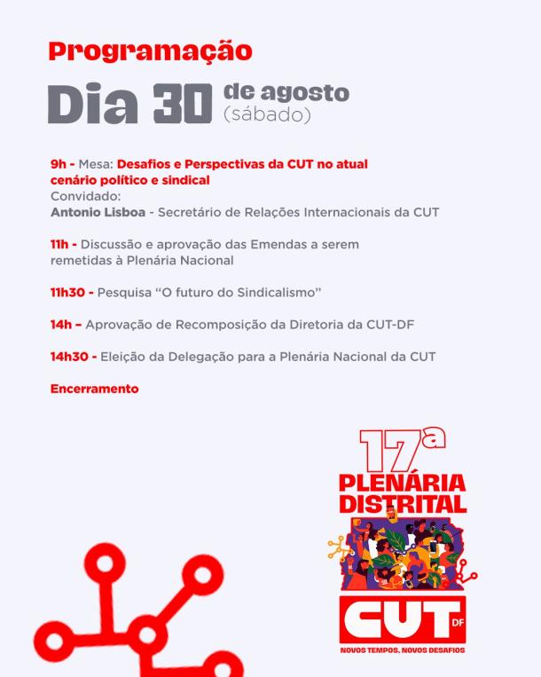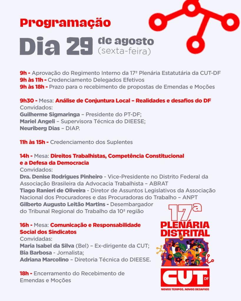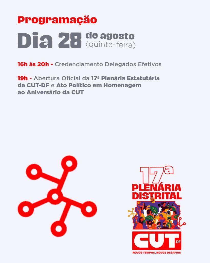 Nos dias 28, 29 e 30/8, a CUT-DF realiza a 17ª Plenária Distrital no Sindicato dos Bancários. O objetivo da atividade é reunir dirigentes sindicais e representantes do movimento sindical CUTista do Distrito Federal para debater estratégias e encaminhamentos que serão levados à instância nacional, diante do atual contexto de lutas da classe trabalhadora.