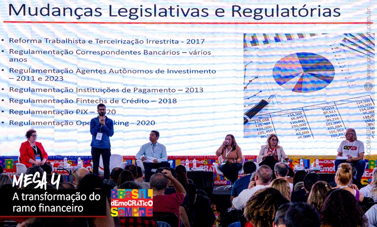 Gustavo traçou um cenário do emprego no ramo financeiro. Ele apontou que o setor financeiro brasileiro passou por uma verdadeira reestruturação, com mudanças nas tecnologias, na legislação trabalhista, na regulamentação do BC e da Comissão de Valores Mobiliários (CVM), na política econômica do país e no papel dos bancos públicos, o que alterou drasticamente o modelo de negócios.