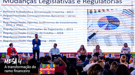 Gustavo traçou um cenário do emprego no ramo financeiro. Ele apontou que o setor financeiro brasileiro passou por uma verdadeira reestruturação, com mudanças nas tecnologias, na legislação trabalhista, na regulamentação do BC e da Comissão de Valores Mobiliários (CVM), na política econômica do país e no papel dos bancos públicos, o que alterou drasticamente o modelo de negócios.