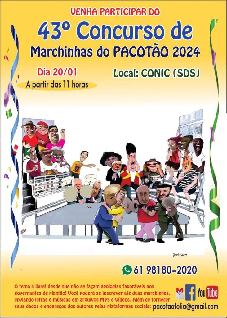 O tradicional Bloco de Carnaval Pacotão, que conta com o apoio do Sindicato, escolhe no próximo sábado (20), no Conic, a partir das 11h, a marchinha do carnaval de 2024. Com a irreverência que é característica da agremiação, eles avisam que o tema é livre, mas é proibido música a favor do governante de plantão.
