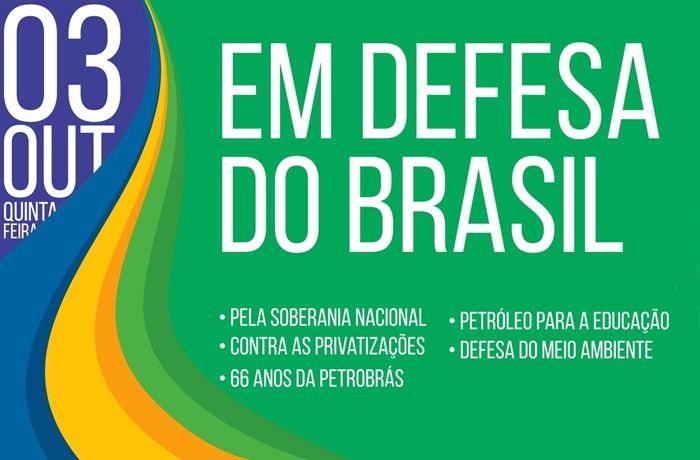 Em defesa da Petrobrás e das empresas públicas brasileiras, em diversos estados brasileiros, trabalhadores e trabalhadoras irão às ruas no próximo dia 3 de outubro, data em que se comemora 66 anos da estatal.