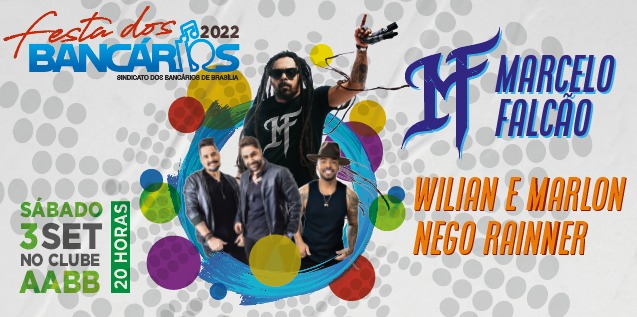 Depois de dois anos sem poder comemorar o Dia do Bancário e da Bancária, celebrado em 28 de agosto, o Sindicato promove em 3 de setembro mais uma edição da tradicional Festa dos Bancários. A celebração, que já faz parte do calendário cultural do DF, terá como atrações o ex-O Rappa Marcelo Falcão, a dupla sertaneja Wilian & Marlon e Nego Rainner.