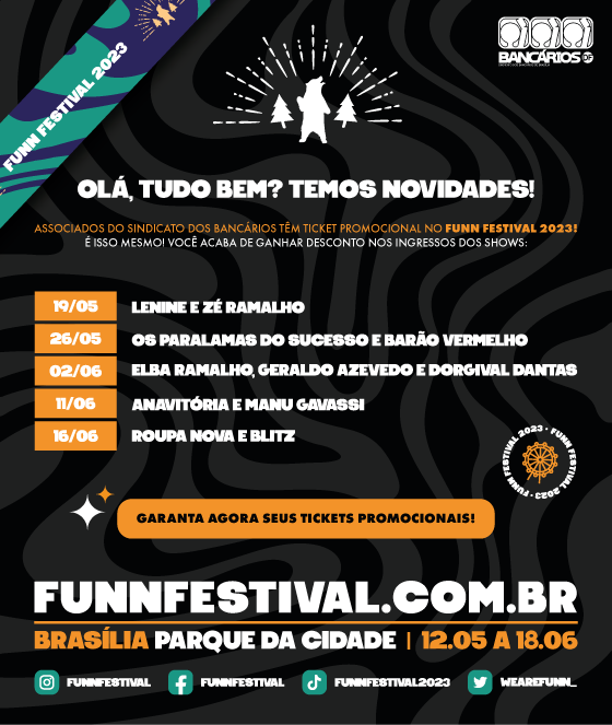 Bancários e bancárias associados ao Sindicato têm 10% de desconto para curtir cinco dias da programação do Funn Festival. Com a parceria entre a entidade e o festival, os sindicalizados têm um ticket promocional para os shows de Zé Ramalho e Lenine, Os Paralamas do Sucesso, Barão Vermelho e Ira, Elba Ramalho, Geraldo Azevedo e Dorgival Dantas, AnaVitória e Manu Gavassi, Roupa Nova e Blitz.