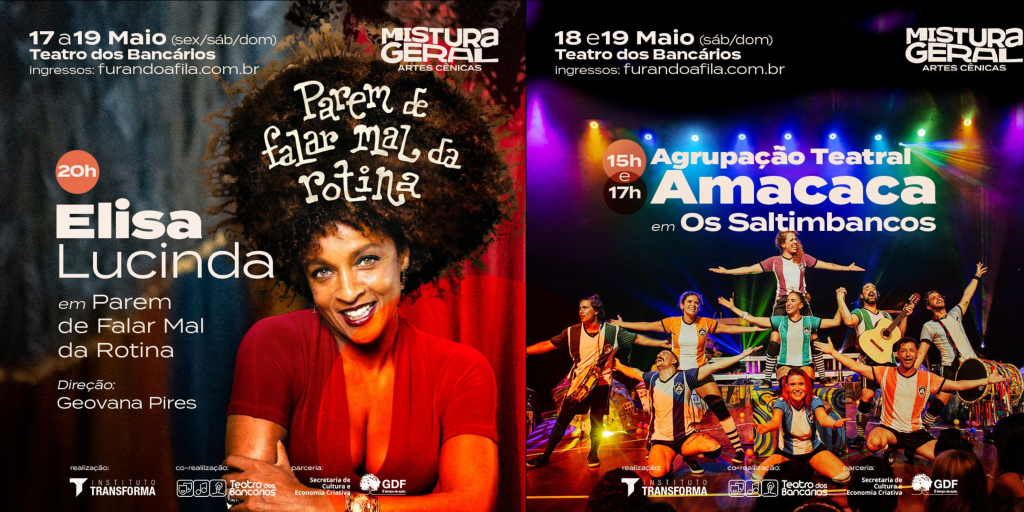 O Festival Mistura Geral começou a todo vapor e, esta semana, o palco do Teatro dos Bancários recebe a companhia brasiliense Agrupação Teatral Amacaca em ‘Os Saltimbancos’ e a atriz, poetisa, escritora e cantora Elisa Lucinda se apresenta com o monólogo ‘Parem de Falar Mal da Rotina’.