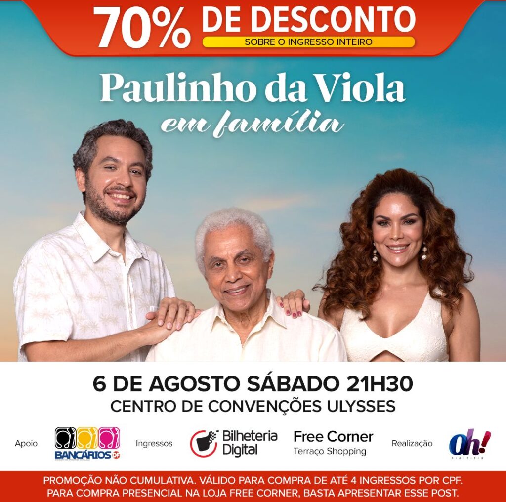 As promoções do Sindicato para os bancários e bancárias sindicalizados participarem dos eventos culturais de Brasília estão cada vez melhores. Para o show inédito Paulinho da Viola & família, que acontece no sábado (6), às 21h30, no auditório Máster do Centro de Convenções Ulysses Guimarães, os associados têm desconto especial de 70%.