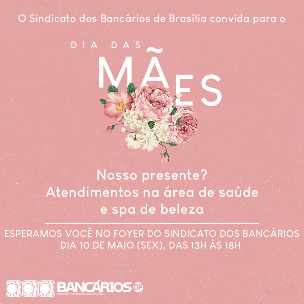 A Secretaria de Aposentados do Sindicato preparou um evento especial para comemorar o Dia das Mães, na sexta-feira, 10 de maio. Haverá uma programação com várias opções de procedimentos, como spa de beleza, cuidados com a saúde, além de uma apresentação com o Coral dos Bancários Aposentados. Também será servido um delicioso lanche.