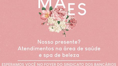 A Secretaria de Aposentados do Sindicato preparou um evento especial para comemorar o Dia das Mães, na sexta-feira, 10 de maio. Haverá uma programação com várias opções de procedimentos, como spa de beleza, cuidados com a saúde, além de uma apresentação com o Coral dos Bancários Aposentados. Também será servido um delicioso lanche.