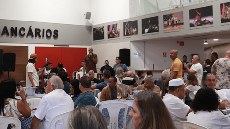 Muita energia e alegria deram o tom do Boteco dos Pais e Avós Bancários Aposentados, promovido pelo Sindicato na sexta-feira (16), à noite. Mais de 200 homenageados, acompanhados de familiares, lotaram o foyer do Teatro dos Bancários, e se divertiram bastante ao som contagiante do grupo Pagode do Chama. Teve também apresentação dos dançarinos da Academia Planet, que deram um show de forró e samba de gafieira.