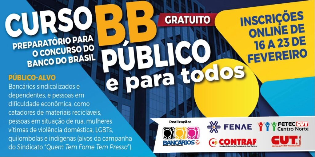 Para o presidente do Sindicato, a realização do “Curso BB Público e para Todos” “é mais uma iniciativa que levamos aos nossos associados e seus dependentes e, ao mesmo tempo, uma maneira de enfrentamento às injustiças, ao promovermos oportunidades às pessoas em situação de vulnerabilidade econômica e grupos historicamente excluídos, para que tenham condições de concorrer”.