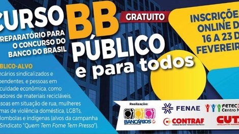 Apoiar e incentivar sindicalizados e dependentes a partir da oferta de curso preparatório gratuito ao concurso público do Banco do Brasil e igualmente promover ações que fortaleçam o debate público e impulsionem as políticas internas da instituição em relação à promoção de igualdade de oportunidades para que negras, negros, quilombolas, indígenas, PCDs, população LGBTQIA+, mulheres - enfim, a diversidade da população brasileira -, seja cada vez mais percebida e reconhecida na atuação e nas diversas instancias de poder, incluídos os postos de comando do BB. É esse o espírito que move a parceria das entidades representativas dos trabalhadores na realização do “Curso BB Público e para Todos”, sensibilizadas a partir da proposição formulada pelo Sindicato das bancárias e dos bancários de Brasília.