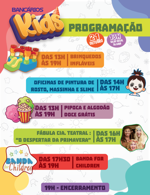Os filhos das bancárias e dos bancários sindicalizados poderão desfrutar de uma tarde superespecial. Haverá apresentação teatral infantil da Fábula Cia Teatral, com o espetáculo O Despertar da Primavera, e show com a banda For Children. A criançada também poderá se divertir nos brinquedos infláveis, nas oficinas de slimes, com massinhas de modelar e pintura de rosto. Além disso, terá algodão doce e pipoca.