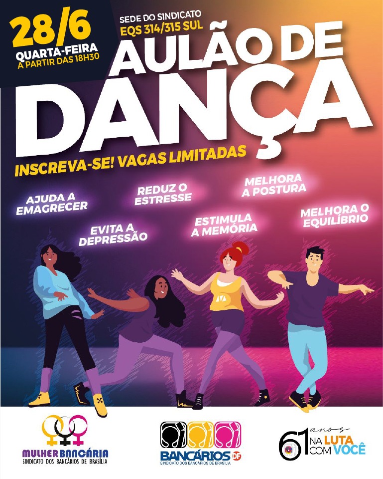 O Sindicato informa à categoria que, uma vez por mês, promoverá um aulão de dança voltado para a categoria. A intenção é oferecer aos bancários e bancárias uma opção de atividade física que seja sinônimo de celebração e terapia. Isso porque a dança promove interação, reduz o estresse, melhora o equilíbrio e a postura, estimula a memória e evita a depressão.