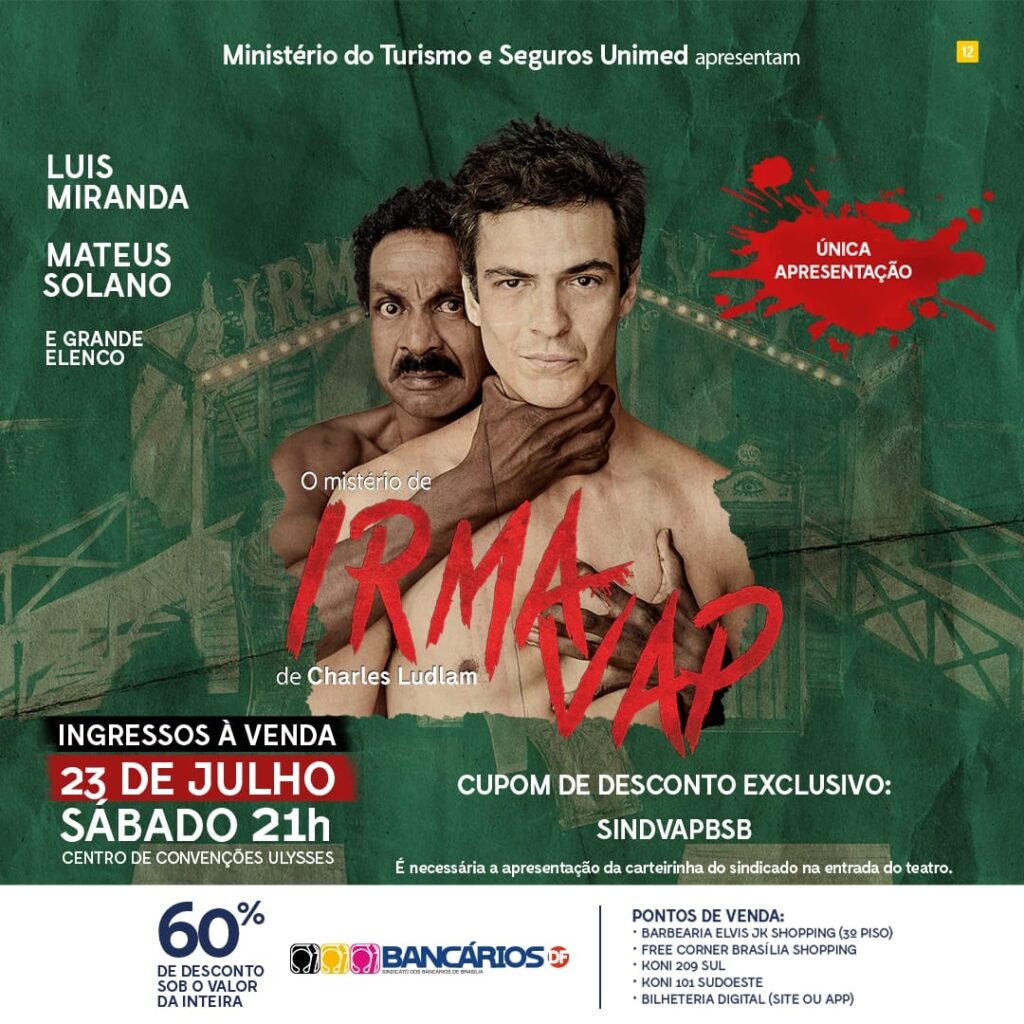 No sábado (23), a primeira opção para os bancários e bancárias sindicalizados é o espetáculo de comédia Os Mistérios de Irmã Vap, estrelada por Mateus Solano e Luis Miranda. Em única apresentação em Brasília, no Centro de Convenções Ulysses Guimarães, a partir das 21h, a peça no estilo besteirol conta a história de Lady Enid, a nova esposa do excêntrico Lord Edgar, em uma mansão mal-assombrada pelo fantasma da primeira esposa de seu marido, Irma Vap.