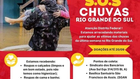 Numa ação conjunta com o Sindicato dos Professores (Sinpro/DF), o Comitê DF/RIDE/GO da Ação da Cidadania Contra a Fome, a Miséria e Pela Vida e a Basílica Santuário São Francisco de Assis, o Sindicato está arrecadando roupas e calçados, roupas de cama e banho, produtos de higiene pessoal e panelas.