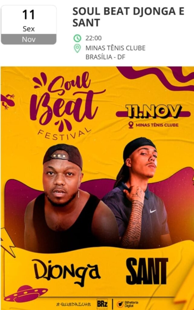 No dia 11, o Minas Tenis Clube recebe o festival Soul Beat. Talentos como Djonga, Cynthia Luz, Sant e a banda Jah Live se apresentam no evento. A grande estrutura contará com feira, estúdio de tatuagem, espaço de beleza e business, além de um super palco para os shows.