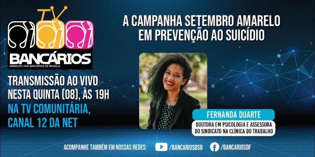 A campanha Setembro Amarelo em prevenção ao suicídio é o tema do TV Bancários desta quinta-feira (8). A convidada do programa é Fernanda Sousa Duarte, mestre e doutora em Psicologia, professora colaboradora no Programa de Pós-Graduação em Psicologia Social do Trabalho e das Organizações da Universidade de Brasília (UnB), diretora de projetos do GEPSAT-Saúde do Trabalhador e assessora da Secretaria de Saúde do Sindicato dos Bancários de Brasília na Clínica do Trabalho.